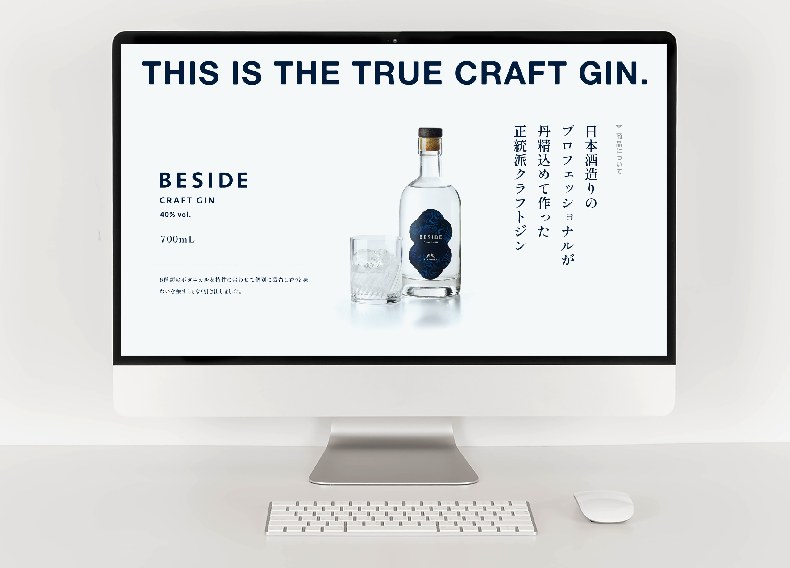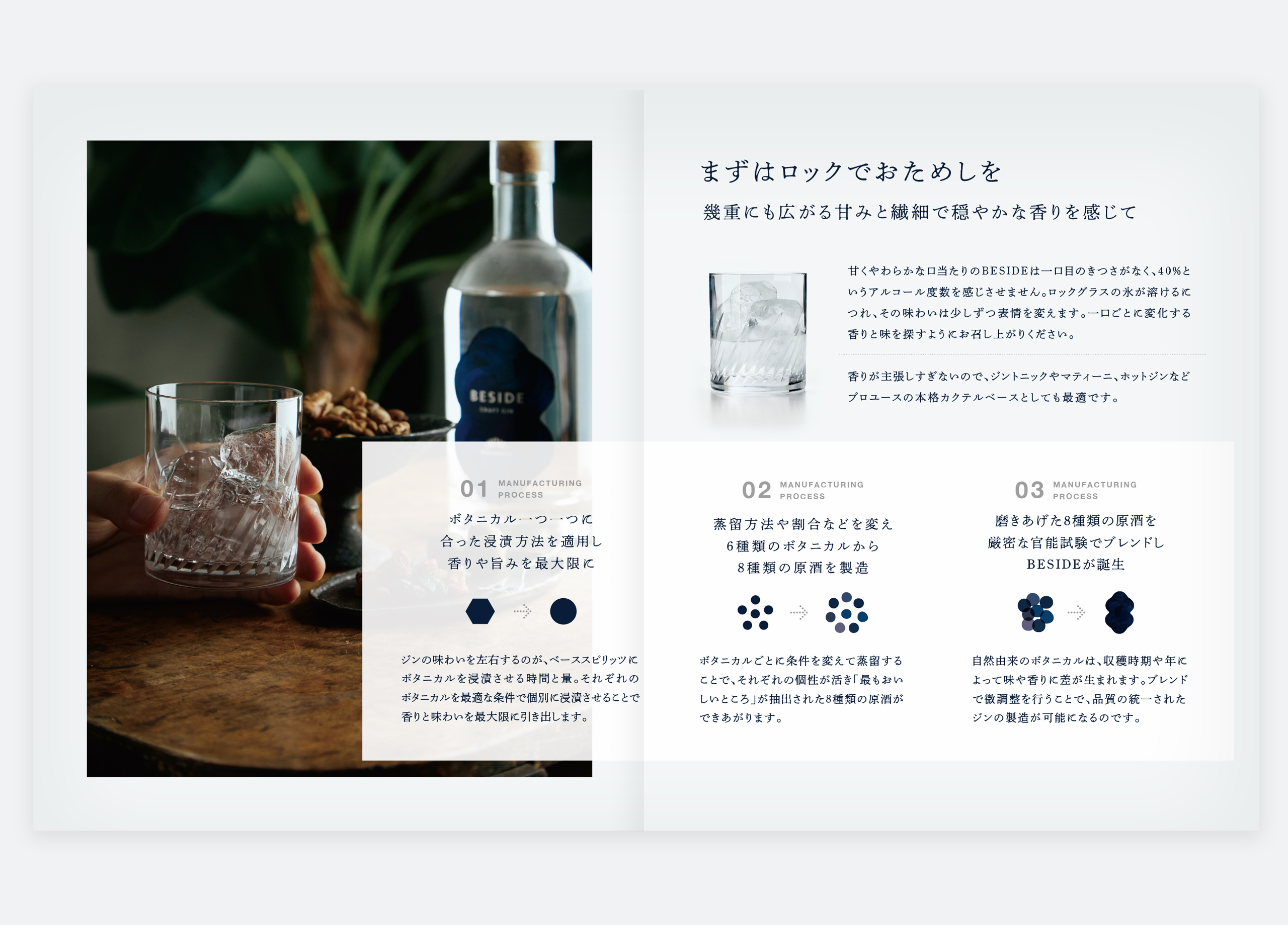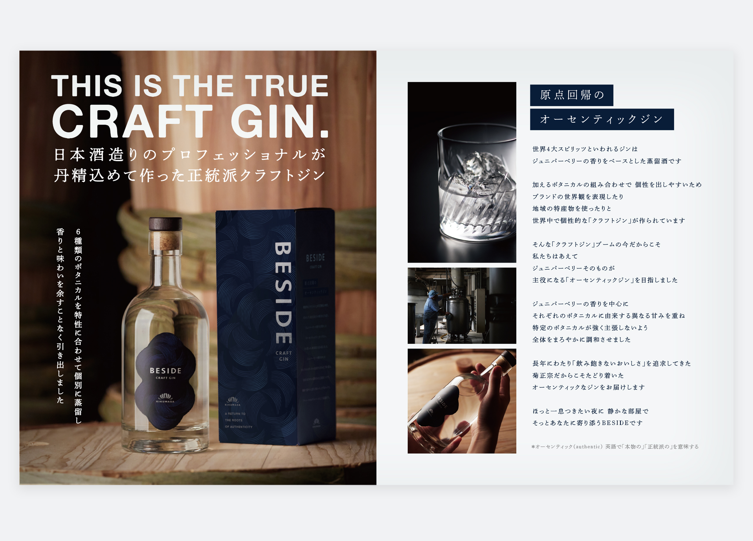 菊正宗酒造株式会社様のクラフトジン「BESIDE」のパッケージ、パンフレット、ランディングページ(LP)をデザインしました。